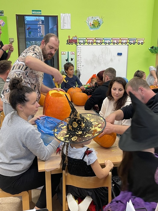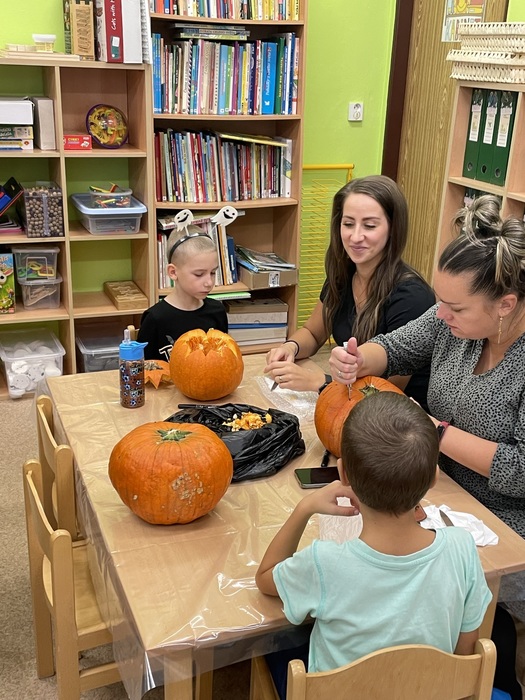 Podzim je tady a s ním již oblíbená tradice v naší školce - vyřezávání dýní. Pozvali jsme rodiče našich dětí a společně jsme si užili zábavné odpoledne plné tvoření, radosti a kreativity. Vyřezávání dýni je skvělý způsob, jak zapojit fantazii a již zmíněnou tvořivost. Každá dýně je potom jedinečná a dítě a rodič si sami určí, jak bude jejich výtvor vypadat. Vyřezaná dýně potom rozsvítila nejen vstupní vchod naší školky, ale především kopeček na školní zahradě. A to dodalo tu správnou podzimní atmosféru.
